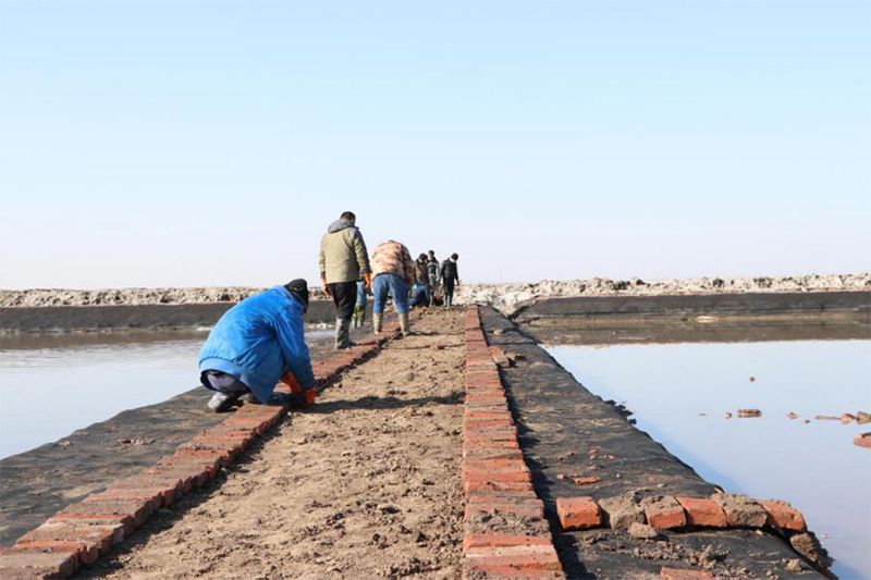 為了做好灘田文明生產(chǎn),長蘆公司生產(chǎn)一線干部職工積極投入到灘內(nèi)護氈工作中。截至2021年2月2日,長蘆公司制鹽四五六工區(qū)共完成護灘埝修整、護氈13200米,完成灘內(nèi)池埝護氈12副灘,累計完成護氈面積達13.3萬平方米。