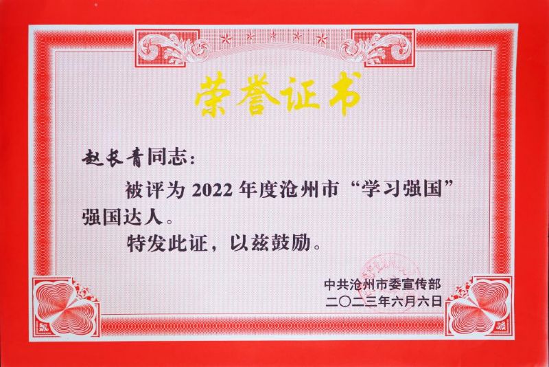 在“學(xué)習(xí)強(qiáng)國(guó)”滄州學(xué)習(xí)平臺(tái)上線兩周年之際,滄州市委宣傳部下發(fā)了關(guān)于評(píng)選全市“強(qiáng)國(guó)達(dá)人”的通知,在全市范圍內(nèi),以總學(xué)習(xí)積分為標(biāo)準(zhǔn)評(píng)選“強(qiáng)國(guó)達(dá)人”。截至5月20日,我公司共有30多名職工學(xué)習(xí)總積分和年度學(xué)習(xí)積分達(dá)到初評(píng)條件。最終,趙長(zhǎng)青憑借總積分優(yōu)勢(shì)被評(píng)選為滄州市“強(qiáng)國(guó)達(dá)人”。