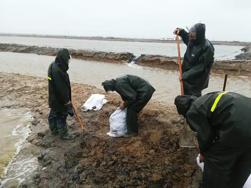 各生產(chǎn)單元及有關(guān)職能部門組織帶領(lǐng)1000多名職工自9日至12日,連續(xù)四個(gè)晝夜嚴(yán)密監(jiān)控,嚴(yán)防死守。其間,防汛辦公室按照渤海新區(qū)防汛部門指示和滄鹽集團(tuán)防汛指揮部要求,多次組織召開(kāi)防汛專題會(huì)議并安排部署防汛措施,關(guān)鍵時(shí)刻調(diào)用6臺(tái)挖掘機(jī)筑埝增高36處共計(jì)1865米,搶險(xiǎn)疏通堵卡攔壩24處,同時(shí)采取了拉閘停電禁止外排淡水的超常措施。暴風(fēng)雨中為提高泄洪排放量,通過(guò)現(xiàn)場(chǎng)冒雨勘查,制定了通過(guò)軍鹽路景觀河、中疏港路上另辟排淡渠道的決策,現(xiàn)場(chǎng)新開(kāi)挖四處排淡應(yīng)急溝道工程,為緩解排淡壓力,避免淡水漫灘贏得了寶貴時(shí)間,更為新區(qū)、園區(qū)化工企業(yè)財(cái)產(chǎn)安全奠定了技術(shù)保障。在搶險(xiǎn)抗災(zāi)的緊要關(guān)頭,長(zhǎng)蘆鹽業(yè)公司組織一線突擊隊(duì)員在風(fēng)雨中砸樁、扛袋、護(hù)埝,嚴(yán)防死守,晝夜奮戰(zhàn)在抗災(zāi)一線,以堅(jiān)強(qiáng)的意志,不屈的精神,譜寫了又一曲抗災(zāi)保產(chǎn)的壯歌。各部(處)室、子公司也按照滄鹽集團(tuán)防汛指揮部的統(tǒng)一部署,緊緊圍繞防汛大局,全力做好保障工作。