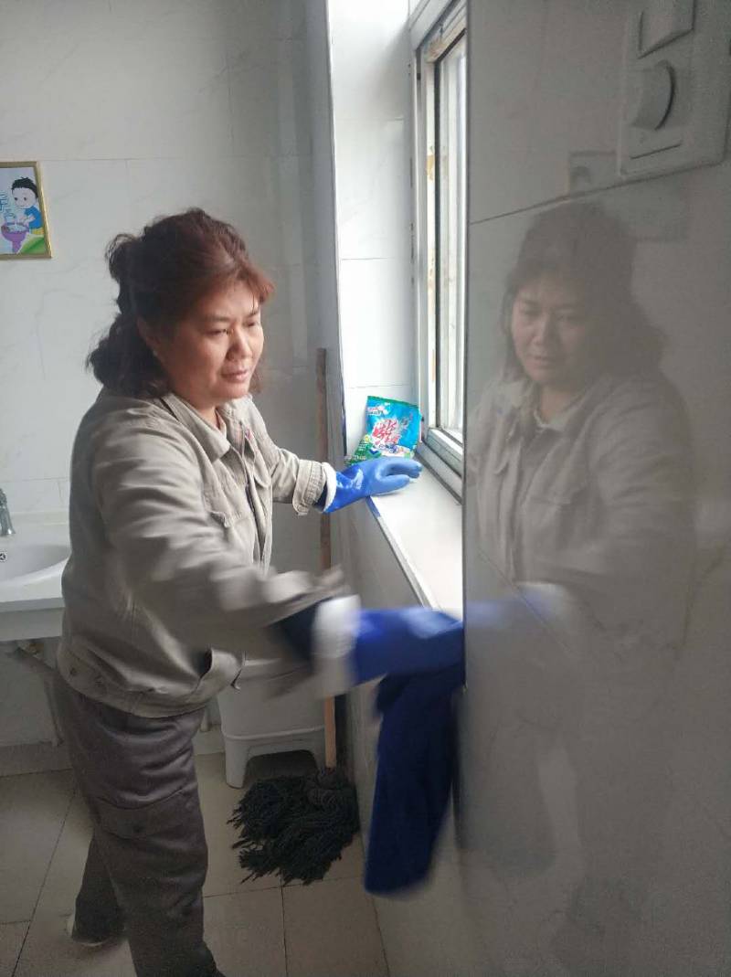 在職工陸續(xù)上崗時,她又拿起笤帚打掃起宿舍、走廊來,并用投洗了幾遍的墩布,仔細地擦拭著房間里的犄角旮旯,直到地面上“照出人影來”才肯罷休。來不及歇息,她又緊接著趕赴下一個“戰(zhàn)場”——衛(wèi)生間。通風、沖洗、消毒、清掃、擦拭、晾曬、整理,這一整套工作她只用30多分鐘就搞定了。