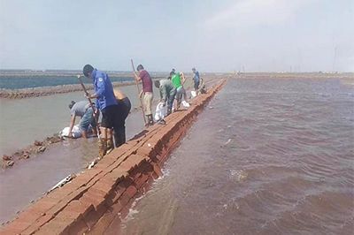 7月12日至13日的大風(fēng)強(qiáng)降水過程,氣象部門提前做出了預(yù)報。長蘆鹽業(yè)公司高度重視,于7月10日專門召開防汛和生產(chǎn)調(diào)度會議,提前做好一切防汛準(zhǔn)備,做到統(tǒng)一指揮調(diào)度,人員全部到位;提前進(jìn)行保鹵、拉放塑苫,并做好塑苫和鹽碼防風(fēng)措施;對排淡設(shè)施設(shè)備、保鹵設(shè)施、房屋、線路、進(jìn)行檢查,對一些薄弱部位進(jìn)行加固,對部分筑裝中的鹽碼進(jìn)行苫封壓實;為預(yù)防降水量過大或潮位過高造成淡水無法外排,各單元還在蒸發(fā)區(qū)和調(diào)節(jié)區(qū)主動騰倒空頭圈,防止淡水倒灌結(jié)晶池。制鹵工區(qū)還對各個重點位置的閘門設(shè)立專人負(fù)責(zé),對納潮泵站房屋、設(shè)備進(jìn)行維修、加固,防止降水和潮水倒灌造成企業(yè)財產(chǎn)損失。