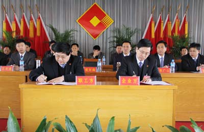 董事長程同海代表企業(yè)與職工方代表李金營簽定工資協(xié)議