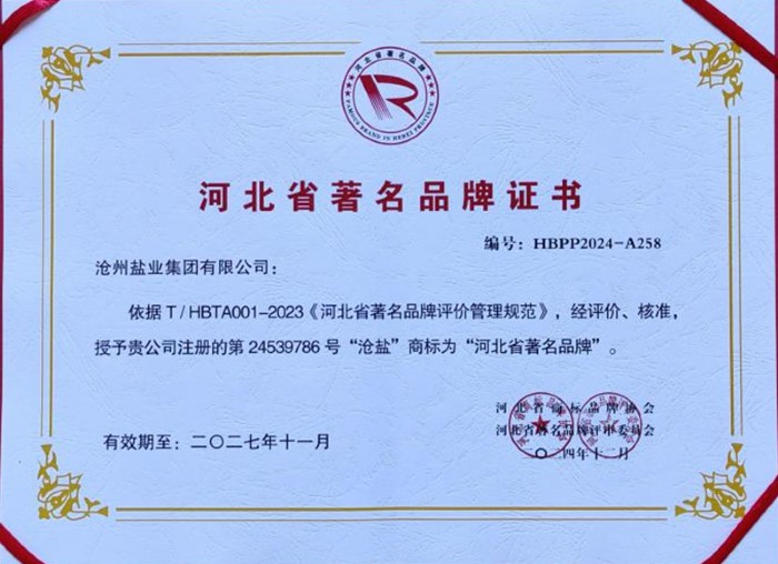 近日,河北省商標(biāo)品牌協(xié)會(huì)組織開展的2024年度“河北省著名、知名、優(yōu)秀品牌”評(píng)選結(jié)果正式揭曉,經(jīng)過嚴(yán)格的評(píng)審和篩選,滄州鹽業(yè)集團(tuán)有限公司注冊(cè)號(hào)為24539786的“滄鹽”牌商標(biāo)被評(píng)定為“河北省著名品牌”,滄州鹽業(yè)集團(tuán)有限公司被授予“河北省商標(biāo)品牌協(xié)會(huì)副會(huì)長(zhǎng)單位”。