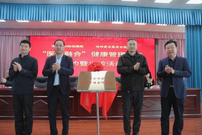在參會人員的共同見證下,張立莊、徐聞鉑分別代表滄鹽集團(tuán)、滄州市婦幼保健院簽訂了“醫(yī)企融合”健康管理合作意向書。張立莊、狄彬、徐聞鉑、崔國光共同為“醫(yī)企融合”健康管理合作單位揭牌。崔國芳代表滄鹽集團(tuán)現(xiàn)場接受了滄州市婦幼保健院捐贈的1600余張健康服務(wù)卡。