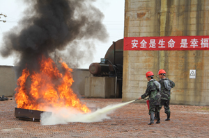 在模擬火災(zāi)現(xiàn)場,現(xiàn)場人員發(fā)現(xiàn)火情及時報告,演練指揮中心立即向救援突擊隊下達救援滅火命令。救援突擊隊第一時間進入現(xiàn)場,救援人員使用干粉滅火器對準(zhǔn)火源實施滅火。由于火勢太大,演練指揮中心下達啟動消防設(shè)施的命令。救援突擊隊立即開啟消防水泵,迅速將火撲滅。