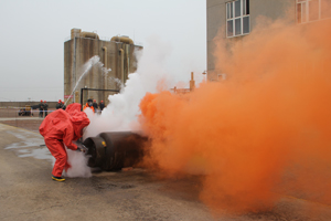 與此同時,在模擬液氯鋼瓶泄漏救援演練現(xiàn)場,液氯鋼瓶發(fā)生泄漏,工作人員立即拉響警報器,救援人員一面組織現(xiàn)場人員用濕毛巾捂住口鼻,向上風(fēng)口方向緊急疏散;一面佩戴專業(yè)空氣呼吸器,身著防化服,破開車間門、窗,用液氯捕消器對泄漏源實施捕消和封堵。救援人員發(fā)現(xiàn)現(xiàn)場有一人氯氣中毒后,立即報告給演練指揮中心,指揮中心立即派出2名救援隊員用擔(dān)架將傷者移至安全地帶,并組織醫(yī)護人員迅速對傷者實施搶救。消防人員則馬上啟動消防設(shè)施,進行水霧空中噴灑,中和、吸附泄漏到空氣中的氯氣,降低危害程度,控制事故范圍。事故處理完畢后,經(jīng)現(xiàn)場毒氣檢測,空氣中氯氣含量降至安全水平。至此,中鹽長蘆滄州鹽化集團有限公司2013年應(yīng)急救援實戰(zhàn)大演練到此結(jié)束。