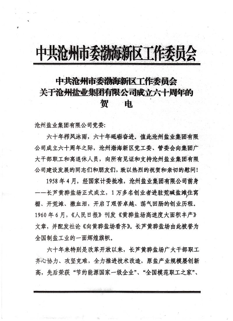 滄州渤海新區(qū)黨工委、管委會(huì)發(fā)來賀電,對(duì)公司成立六十周年表示祝賀,對(duì)公司過往取得的輝煌成就予以充分肯定,并寄望滄鹽集團(tuán)繼續(xù)發(fā)揚(yáng)滄鹽精神,深化改革,加快推進(jìn)轉(zhuǎn)型升級(jí),助力滄州渤海新區(qū)高質(zhì)量發(fā)展。