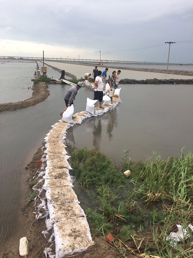 此次特大風(fēng)暴潮天氣,降雨量平均190毫米,局部達到220毫米,颶風(fēng)9到10級。由于降雨連續(xù)時間長,短期內(nèi)降雨強度大,已遠遠超出我公司排淡系統(tǒng)正常的承受范圍。造成大面積護灘埝和排淡溝埝沖垮,多處閘涵坍陷,部分塑膜、浮板損壞,灘內(nèi)一片汪洋,部分度汛鹵水損失殆盡,池存鹽也受到不同程度的損失,廣大職工歷盡艱辛恢復(fù)起來的生產(chǎn)基礎(chǔ)遭受到嚴(yán)重破壞。